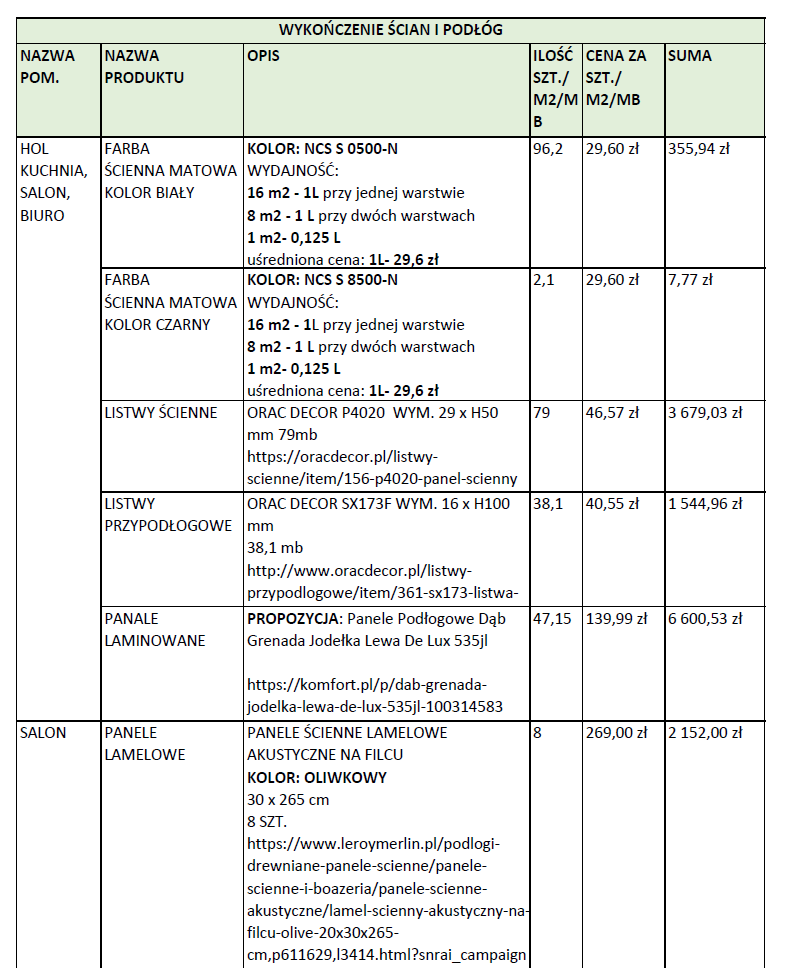 Rozbudowane zestawienie produktów oraz materiałów wykończeniowych potrzebnych do realizacji projektu. Obejmuje dodatkowo specyfikację produktów oraz ich liczbę, sprawiając, że zakupy są w pełni komfortowe.