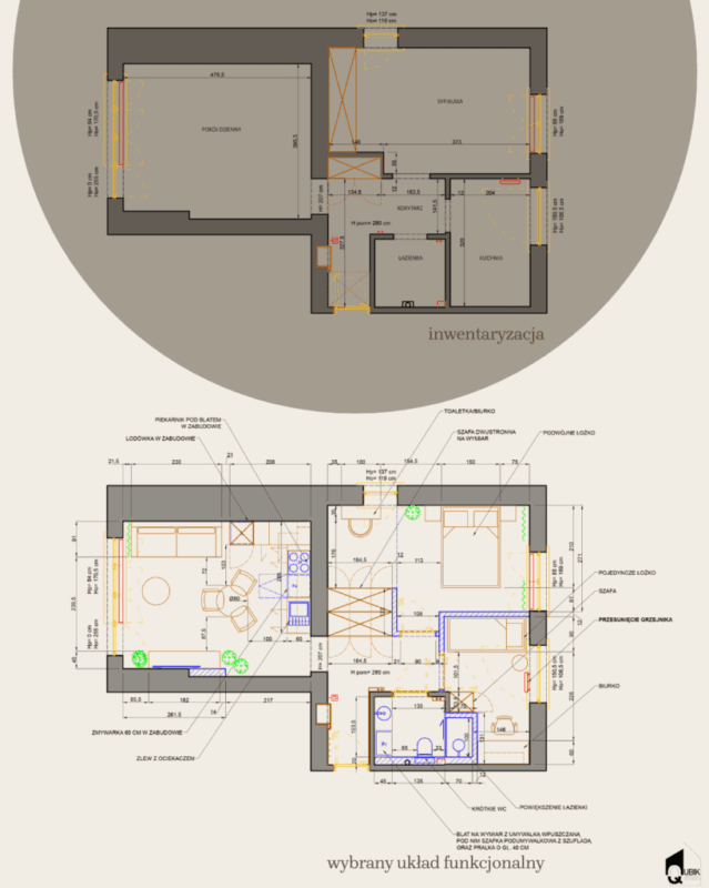(w tym rysunki dla stolarza), a także zestawienia materiałów i wyposażenia.