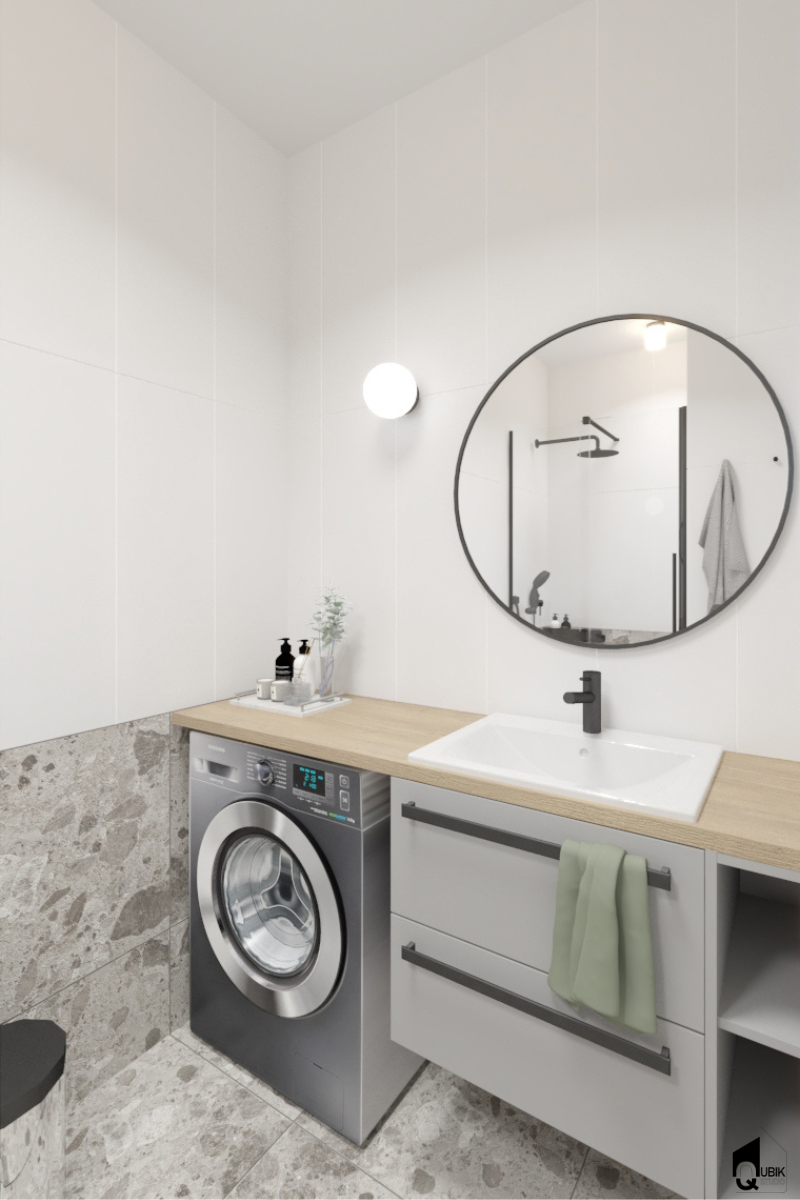 Projekt zakładał całkowitą zmianę układu funkcjonalnego — kuchnia została przeniesiona do salonu, co pozwoliło na wygospodarowanie dodatkowego pokoju idealnego na aranżację domowego biura lub pokoju dziecięcego. Łazienka, wcześniej mikroskopijna, została powiększona o wnękę prysznicową,